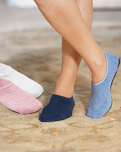 The next best thing to barefoot, our Moon Boot Slippers provide added comfort and security with flexible, skid-resistant soles for indoor and outdoor wear. This fine comfort footwear is made with a soft, snug-fitting terry upper, they're compact, machine washable and great for traveling. Colors: Blue. Navy. Pink. White * Comfortable footwear with a flexible, skid-resistant sole * Safe and comfortable - indoors or out * Soft, pliable terry upper for snug fit * Compact design ideal for travel * Cotton-Polyester upper * Machine wash and dry * Made in the USA * Colors: Blue. Navy. Pink. White. * Sizes: S(5-6), M(6-7), L(7-8), XL(9-10)